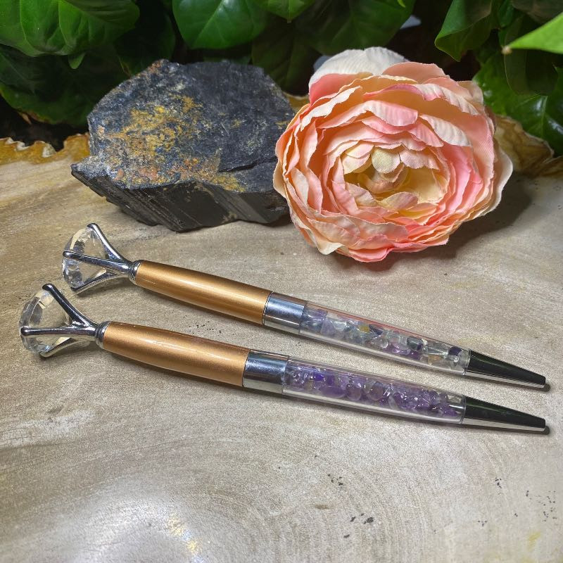 køn krystal kuglepenMed ametyst eller fluorit og stor glas diamant itoppenDe måler 15cm