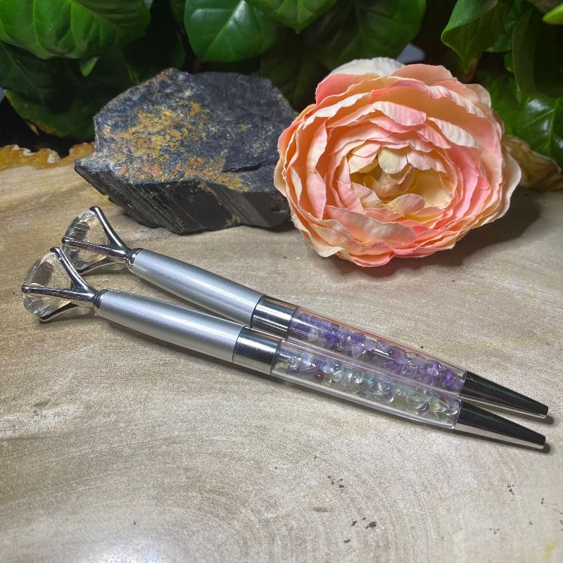 køn krystal kuglepenMed ametyst eller fluorit og stor glas diamant itoppenDe måler 15cm